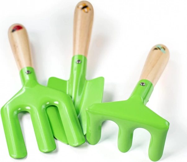 Elk onderdeel is ontworpen voor kleine handjes: gladde houten handgrepen liggen prettig in de hand, metalen delen zijn duurzaam en de stoffen handschoenen bieden bescherming tijdens het werk. De set is ideaal voor spel in de tuin of in de zandbak en dankzij de compacte verpakking is alles altijd bij de hand.