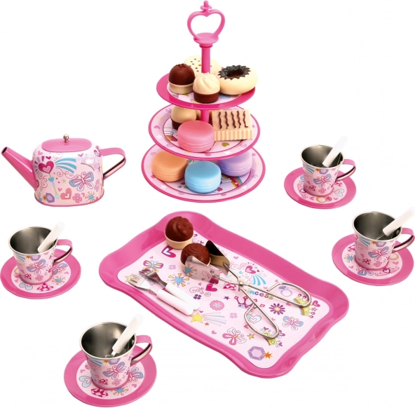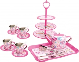 Compleet servies met theepot, kopjes, schoteltjes, dienblad en een etagère voor lekkernijen – alles voor een realistische theeparty.