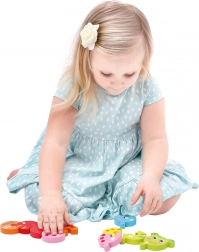 Een kleurrijke houten puzzel in de vorm van een rups helpt kinderen spelenderwijs de volgorde en basisgetallen te leren. De robuuste stukken zijn makkelijk vast te pakken, helder gekleurd en houden de aandacht vast. Gemaakt van massief hout met veilige verven, geleverd in een praktische koker met draaglus voor eenvoudig meenemen.