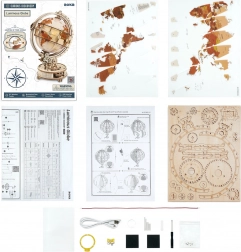 Ontdek de magie van de wereld met een decoratief én functioneel model: een houten globe met LED-verlichting die je zelf in elkaar zet. Dankzij een tandwieloverbrenging draait de globe soepel rond, met een mechanische loep voor het lezen van details en zuinige LED-verlichting gevoed via microUSB/USB-A. De bouwset van hoogwaardig multiplex biedt een hoge moeilijkheidsgraad, test je geduld en concentratie grondig en verandert na het bouwen in een stijlvolle nachtlamp met retro design.