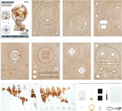 Deze 3D-bouwset combineert slimme mechanica met esthetisch design. De houten globe met zichtbare tandwielen draait moeiteloos; de warm getinte verlichting creëert een gezellige sfeer en dankzij de mechanische loep lees je comfortabel ook kleine plaatsnamen. De retrolook met rijke ornamenten wordt aangevuld met schaalverdelingen voor breedte-/lengtegraden en markeringen van tijdzones.