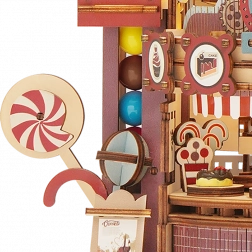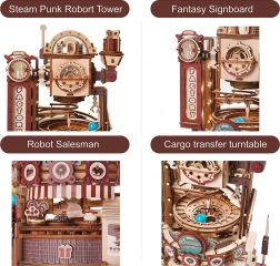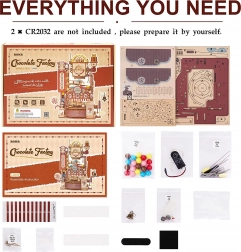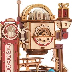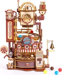 Vervul uw droom van een eigen chocoladefabriek met deze gedetailleerde knikkerbaanpuzzel van triplex. Kogeltjes in zoete kleuren reizen door een robotproductielijn langs talloze obstakels, die vergezeld gaan van de meest fantastische scènes uit de snoepfabricage. Sommige obstakels maken gebruik van helder acryl of openende deurtjes zodat u de capriolen van de kogeltjes in detail kunt bekijken. Klanten aantrekken kan met een klein belletje met zachte klank en een rijk verlichte aanduiding (batterijen zijn inbegrepen). Robotime knikkerbaanpuzzels bieden ongekende details en veelzijdigheid. Elke baan kan pronken met originele functionele details en bizarre obstakels die vaak ingenieus de baan van de kogeltjes veranderen, wat zorgt voor buitengewone pret. De mechaniek wordt aangedreven door handbediening, door middel van een slinger waarmee de kogeltjes ook worden opgetild en regelmatig op pad worden gestuurd. De puzzel wordt ongesorteerd geleverd, verpakt in een doos. Uitgerust met een gedetailleerde montagehandleiding. Belangrijkste kenmerken: knikkerbaanpuzzel 420 precies uitgesneden stukjes hoge moeilijkheidsgraad voor montage lichteffect (2×CR2032 batterijen zijn inbegrepen) metalen belletje