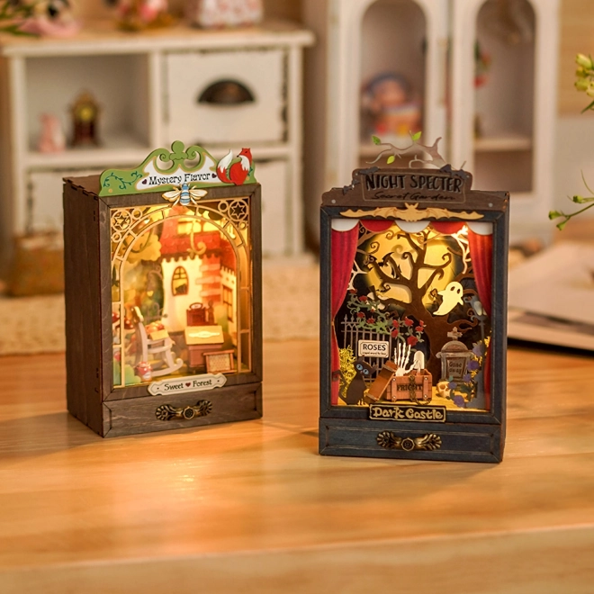 Bereid je scène voor en speel magische voorstellingen in kast-diorama's. Dit miniatuurtheater is voorzien van warm LED-licht, dat diepte en sfeer aan je scène geeft. Verborgen schuifpanelen van helder plastic beschermen je decoratie tegen stof.