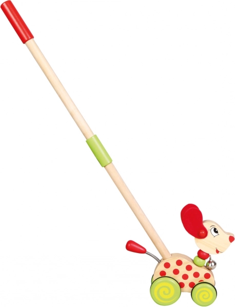 De houten duwhond op een stok van het merk Bino is een geliefd bewegingsspeelgoed dat kinderen motiveert om te lopen en actief te bewegen. Bij het vooruit duwen rinkelt het hondje met een belletje zachtjes, wat kinderen leuk vinden en aanzet tot nog meer stapjes. De rubberen wieltjes zorgen voor een vloeiende en stille rit op diverse ondergronden.