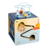 De kubus biedt interactieve elementen zoals kralenbanen, doolhoven en vormsorteren, die helpen bij het herkennen van kleuren en vormen.