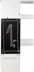 Het bord aan de zijkant van de kraam maakt het mogelijk om prijzen en berichtjes te schrijven; het plankje houdt het krijtje altijd binnen handbereik.