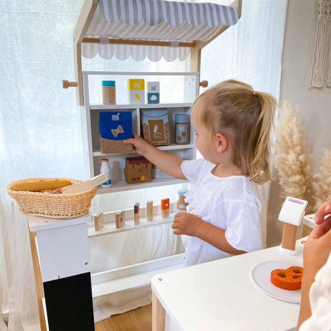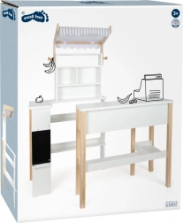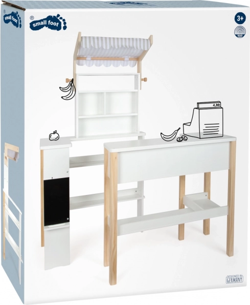 De houten verkoopkraam SMALL FOOT Fresh verandert de kinderkamer in een kleine markt. De minimalistische look in wit en naturel hout past in elk interieur, terwijl de afneembare gestreepte luifel een authentieke winkeluitstraling geeft. Het beschrijfbare bord met plankje nodigt uit tot het maken van opschriften en prijskaartjes.
