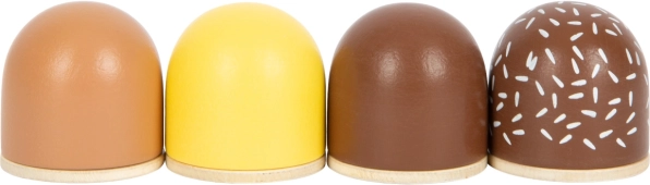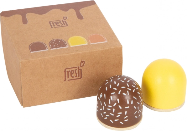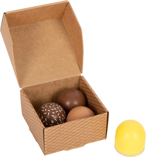 Vier soorten pralines - witte chocolade, donkere chocolade, donkere chocolade met strooisel en melkchocolade - verfrissen kinderspelletjes op een aangename manier. Hun natuurlijke uitstraling en eco-vriendelijke kartonnen verpakking zijn ontworpen om kinderen te inspireren en te enthousiasmeren voor fantasierijk spel.