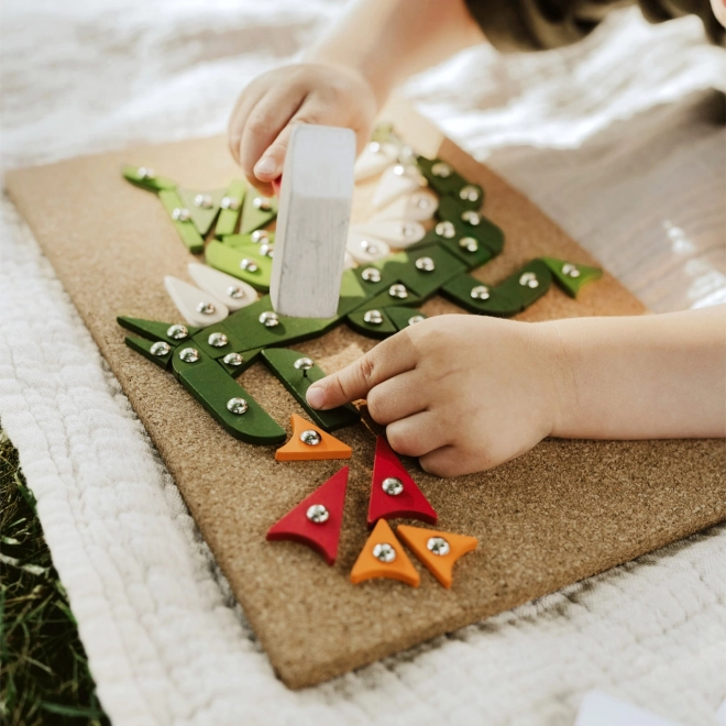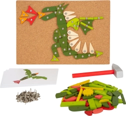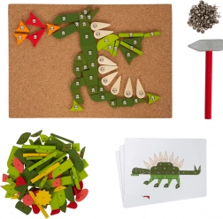De set bevat een kurken onderlegger, een houten hamer, gekleurde stukjes en punaises om afbeeldingen te maken.