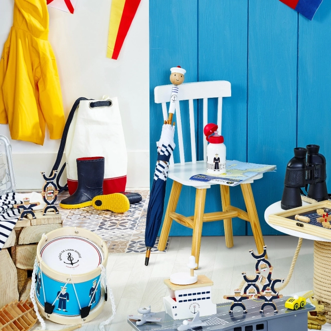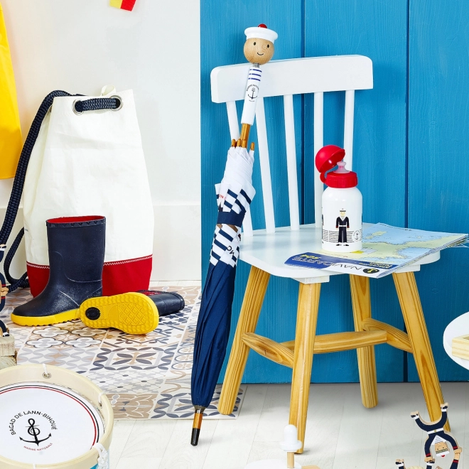Stijlvolle kinderparaplu met zeemansmotieven van het merk VILAC die elke kleine en grote avonturier zal verrassen. Dankzij de combinatie van een lichte carbonconstructie, een massieve houten handgreep met een veerkrachtig gemonteerde kop en een veilig sluitsysteem is hij ideaal voor wandelingen in de regen. Gemaakt in Frankrijk in samenwerking met de Franse marine.