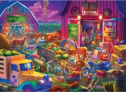 Een kleurrijke scène vol details – een schuur met het opschrift For Sale, boerderijdieren, een oude vrachtwagen met oogst en seizoensdecoraties. Ideaal voor liefhebbers van landelijke thema’s en verfijnde illustraties.