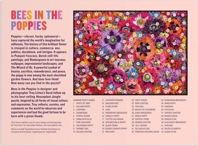 Deze premium puzzel van het merk GALISON toont een uniek beeld van de Amerikaanse reiziger en fotograaf Troy Litten: bijen tussen tientallen variëteiten klaprozen. Het hoge detailniveau en het kleurcontrast zullen iedereen bekoren die op zoek is naar een kwalitatief en esthetisch indrukwekkend motief.