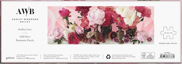 Geniet van ontspanning met de panoramische puzzel met het motief Endless Love van ASHLEY WOODSON BAILEY. Luxe puzzel van 1000 stukjes van GALISON, gemaakt van gerecycled papier, met hoogwaardige druk in veilige inkten, een matte afwerking voor natuurgetrouwe kleuren zonder schittering en een zorgvuldig gekozen bloemenmotief geïnspireerd op Nederlandse stillevens.
