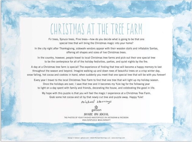 Ontdek de magie van Kerst met de GALISON-puzzel met een boerderij vol kerstbomen. De gedetailleerde illustratie van de bekroonde ontwerper Michael Storrings brengt vreugde, kleur en een feestelijke sfeer in elk huis. De matte afwerking en de gladde achterkant zorgen voor prettig puzzelen en een lange levensduur.