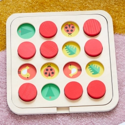 Het speelbord met 16 afdekschijven is ontworpen voor jonge spelers vanaf 3 jaar. Het ondersteunt de ontwikkeling van cognitieve vaardigheden, het herkennen van vormen en kleuren, en traint geduld en concentratie. De illustraties zijn opvallend, speels en makkelijk leesbaar.