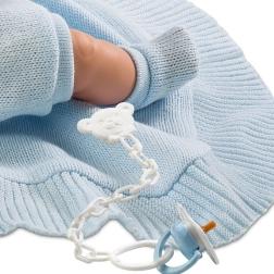 De NEW BORN JOEL LLORÓN-baby van 38 cm is met oog voor detail gemaakt – verfijnde gelaatskenmerken, zachte stoffen en comfortabel aankleden. Na het verwijderen van de speen hoor je “mama”, “papa” en een levensecht huilgeluid, dat je eenvoudig stopt door de speen opnieuw te plaatsen.