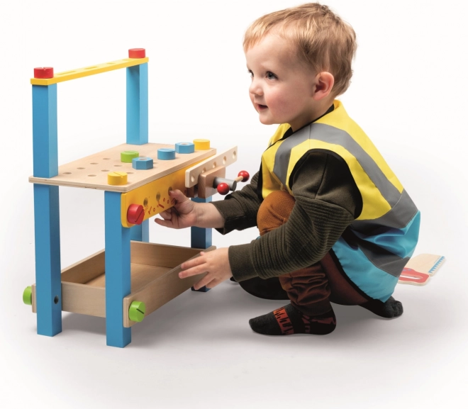 De set bevat zowel houten als kunststof tools – zaag, schroevendraaier, pijpentang, hamer, veiligheidsbril en pas. Kinderen kunnen zo het werk van bouwvakkers nabootsen en hun fijne motoriek ontwikkelen.