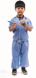 - T‑shirt, broek, houten stethoscoop, doktersmap, thermometer, zakhorloge, injectiespuit, pleisters