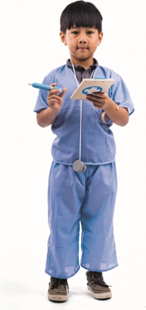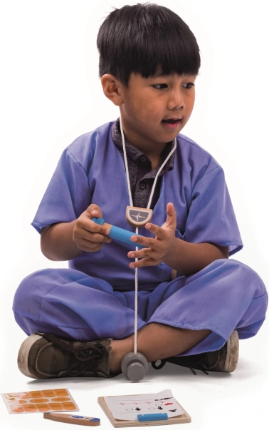 Het dokterskostuum voor kinderen van BIGJIGS TOYS verandert elk spel in een reddingsmissie. De set bestaat uit een blauw T‑shirt en broek met klittenbandsluitingen voor makkelijk aan- en uitkleden, plus veel accessoires: houten stethoscoop, doktersmap voor notities, thermometer, zakhorloge, injectiespuit en pleisters. Het kostuum is gemaakt van katoen en polyester en is machinewasbaar.