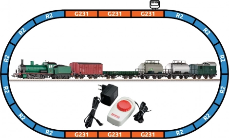 - Rails met bedding: 12× boog R2 (55412), 5× recht G231 (55401), 1× recht G231 met voedingsaansluiting (55406)