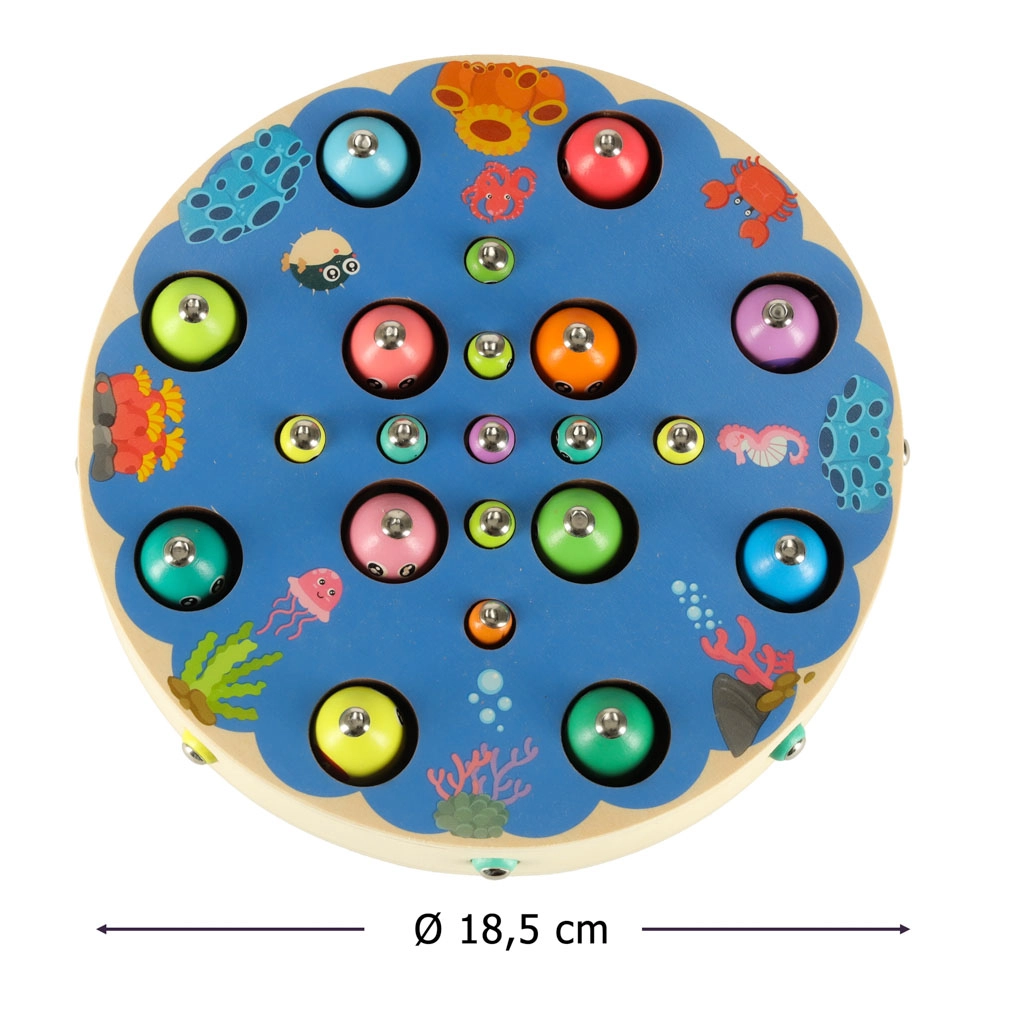De multifunctionele Montessori-set biedt kinderen urenlang creatieve pret en leren. Op de ronde houten basis met oceaanthema vangen kinderen magnetische visjes met hengels, trekken ze rupsjes omhoog, verplaatsen ze knikkers met behulp van een pincet of stokjes en oefenen ze kleuren, sorteren en geduld. Dankzij de rijke accessoires kunnen meerdere kinderen tegelijk spelen.