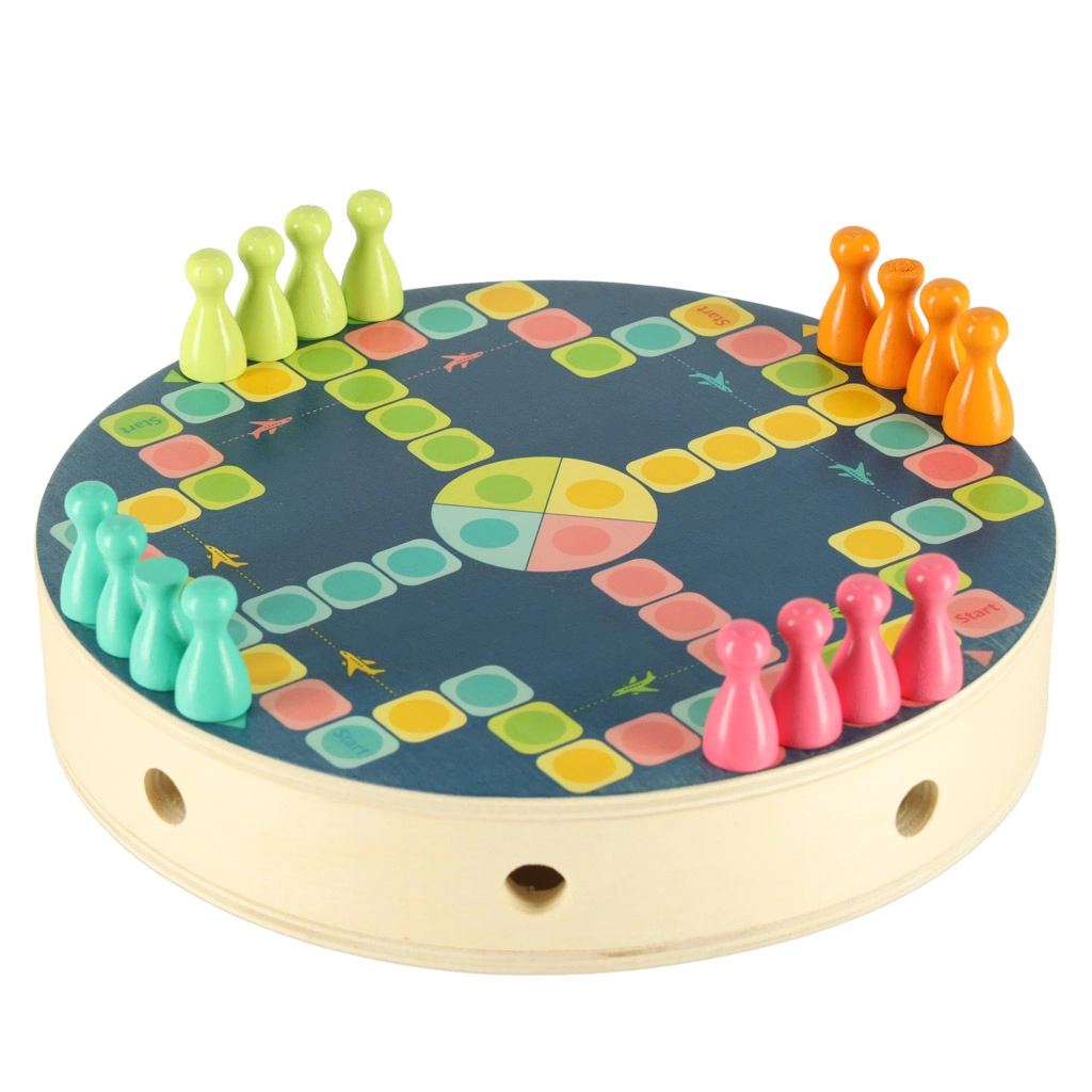 Het draaibare/verwisselbare bovenblad biedt vissen, pop-up elementen en een bordspel met pionnen en dobbelsteen – één set, veel speelmogelijkheden.