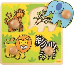 Wanneer kinderen alle stukjes op de juiste plek leggen, ontstaat er een levendige safariscène. Dankzij de grote knoppen liggen de stukjes goed in kleine handjes en stimuleert het puzzelen het benoemen van dieren, het uitbreiden van de woordenschat en de oog-handcoördinatie.
