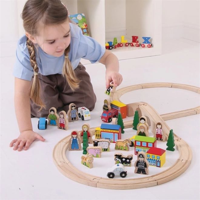 Deze uitgebreide set brengt een levendig stadje én het platteland naar elke kinderspoorweg. Je vindt er figurines zoals een politieagent en brandweerman, handige voertuigen waaronder een auto en brandweerwagen, gebouwen, bomen en boerderijdieren – allemaal in duurzaam hout met aangename kleuren. Kinderen kunnen hun eigen verhalen creëren, treinen laten stoppen, het verkeer regelen of voor de boerderij zorgen.
