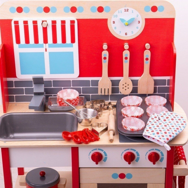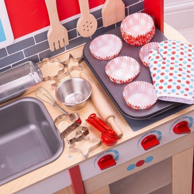 Deze uitgebreide bakset bevat alle uitrusting die elke kleine kok nodig heeft voor de eerste bakervaringen. Inclusief bakplaat, ovenwant, cakeblik, garde, houten deegroller, kom, set maatlepels en zes uitsteekvormpjes voor gebak.