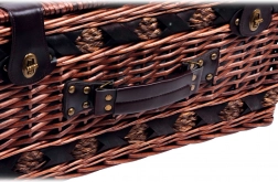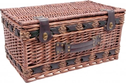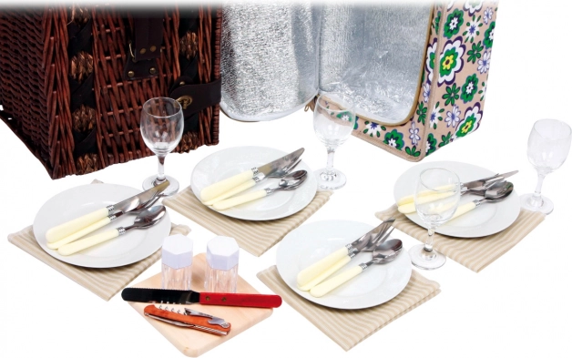 De mand bevat alles wat je nodig hebt voor een picknick met familie of vrienden: borden, bestek, wijnglazen, mes, peperstrooier, zoutvaatje en servetten.
