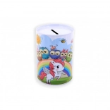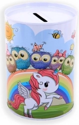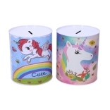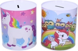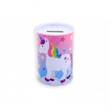 De spaarpot is versierd met vrolijke illustraties van eenhoorns die een speelse touch geven aan elke kinderkamer.