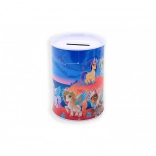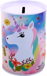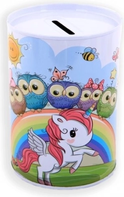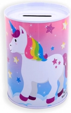 De metalen spaarpot met eenhoornmotief is niet alleen een praktische hulp bij het sparen, maar ook een prachtige decoratieve toevoeging aan de kinderkamer. De kleurrijke illustraties van eenhoorns, regenbogen en sterren zullen elk kind blij maken.