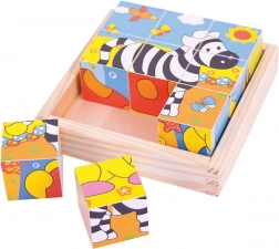 Negen houten blokken vormen zes verschillende afbeeldingen. Draai elk blokje om en maak de afbeelding, of mix ze voor extra plezier! Elk stuk is ontworpen om het oppakken, vastgrijpen en ontdekken door kleine handjes te vergemakkelijken.