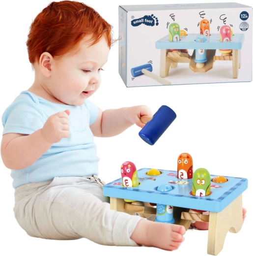 De leuke houten hamertafel van het merk Small Foot met vogeltjesmotief stimuleert de motoriek en concentratie van kinderen. De set bevat een stabiele bank in lichtblauw, gekleurde pinnen en een houten hamertje. Het speelgoed ondersteunt de oog-handcoördinatie, nauwkeurigheid van de slag en het leren van kleuren en cijfers, is gemaakt van kwalitatief hout en is geschikt voor kinderen vanaf 18 maanden.