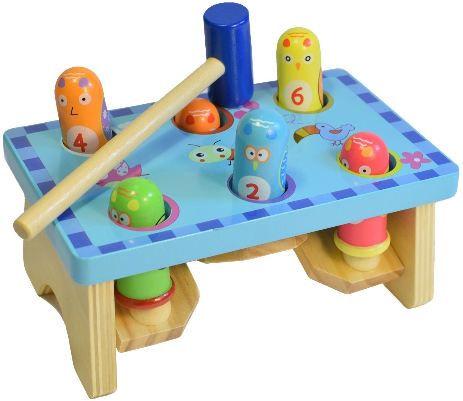 Deze houten hamertafel met vrolijke vogeltjesmotieven geeft kinderen plezier in het ontdekken van oorzaak en gevolg – wanneer je de ene pin inklopt, springt een andere omhoog. De stabiele constructie, gladde randen en heldere kleuren maken de bank aantrekkelijk en veilig voor dagelijks spelen.