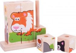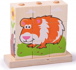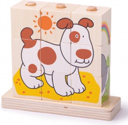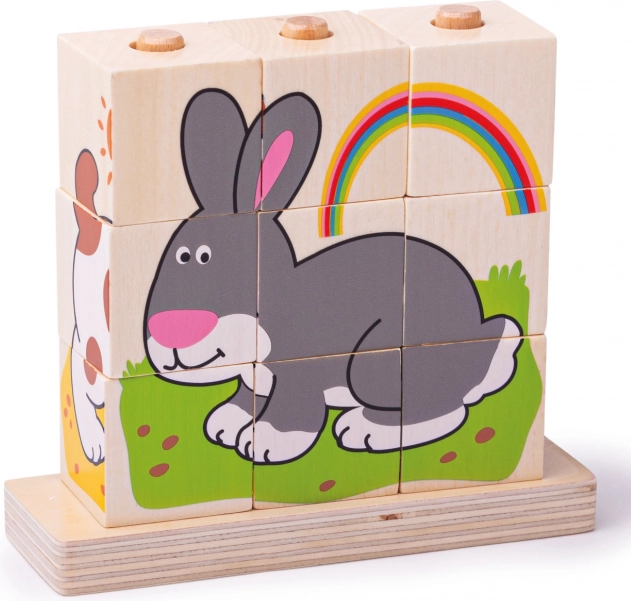 Negen blokjes vormen vier verschillende dierenmotieven die uitnodigen tot herhaald puzzelen en logisch denken en visuele waarneming stimuleren.