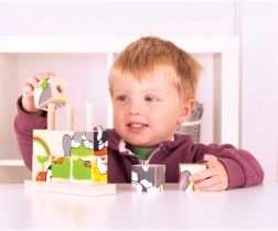 De houten stapelblokjes Bigjigs Baby zijn een uitstekende keuze voor de eerste puzzels. Kinderen oefenen hun greep, vingervaardigheid en visuele waarneming bij het zoeken naar de juiste zijden van de blokjes en het plaatsen ervan op de pinnetjes. De kleurrijke illustraties van dieren moedigen herhaald spelen aan en ondersteunen de concentratie.