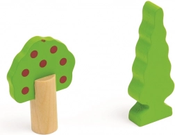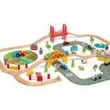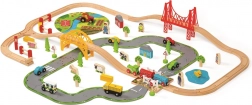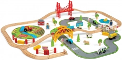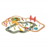 Deze houten treinbaan met landelijke weg is de perfecte combinatie van een treinbaan en autobaan, die de echte wereld van verkeer nabootst. Dankzij bruggen en overgangen worden uw kinderen meegenomen naar een wereld vol leuke avonturen. Het geheel is aangevuld met lokale accessoires zoals een boerderij, gebouwen en bomen, die de omgeving verfraaien.