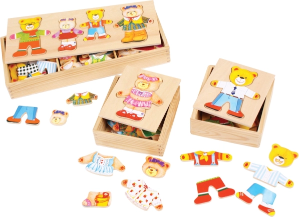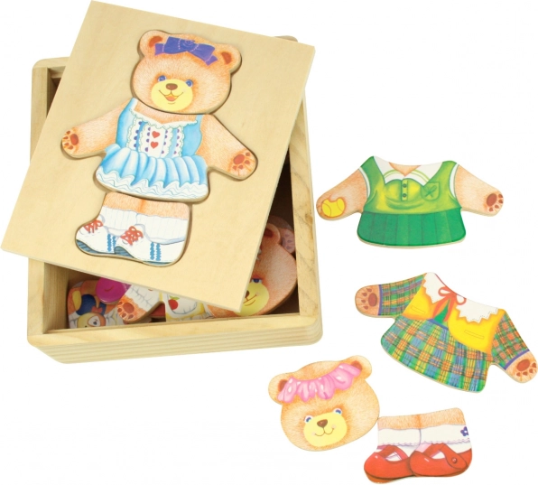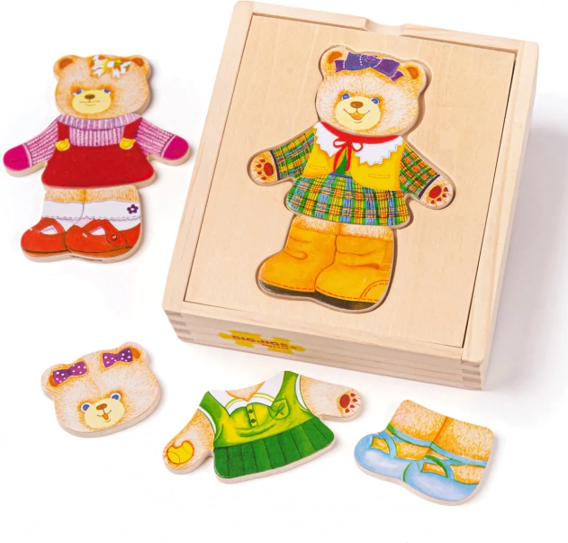 Schattige houten aankleedpuzzel voor de allerkleinsten helpt kinderen outfits en gezichtsuitdrukkingen van de berin te combineren. Bevat 18 stukjes, een praktisch doosje met deksel-ondergrond en stimuleert fijne motoriek, oog-handcoördinatie en woordenschat. Gemaakt van hoogwaardig hout, veilig vanaf 3 jaar en conform Europese veiligheidsnormen.