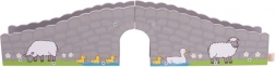 Ontworpen in grijs, lijkt op een stenen brug met illustraties van boerderijdieren voor een authentieke ervaring.
