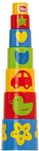 Piramide met vormpjes van Gowi - ideaal speelgoed voor zwembaden en zandbakken. Ontwikkelt cognitieve vaardigheden en fijne motoriek dankzij de afbeeldingen en de oplopende maten.