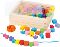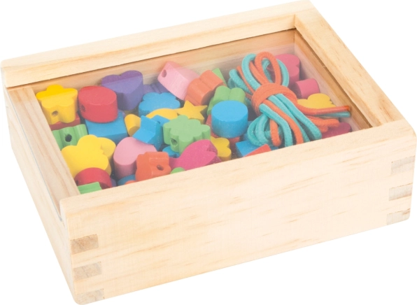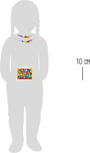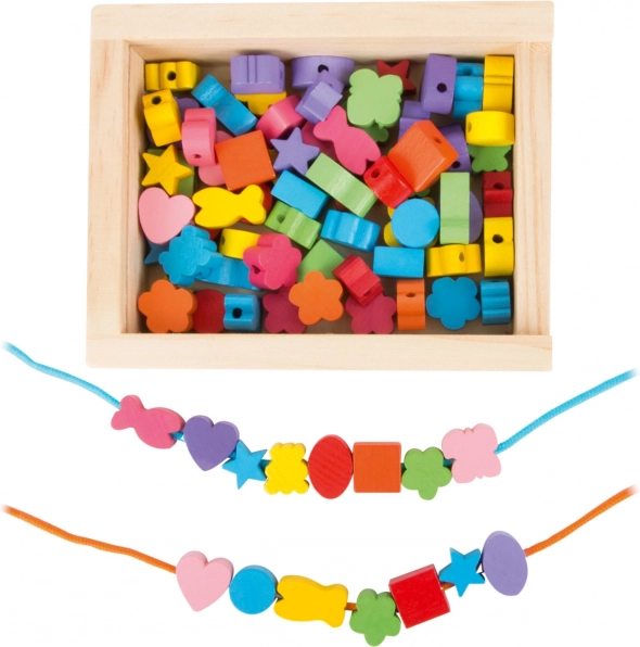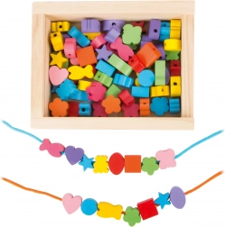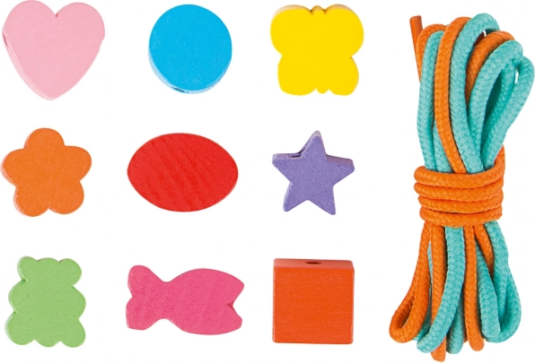 Kleine creatievelingen kunnen uren plezier hebben met deze houten set. De doos bevat 81 kleurrijke kralen en 2 koorden, waarmee kinderen allerlei sieraden kunnen creëren die aansluiten bij hun eigen voorkeuren.