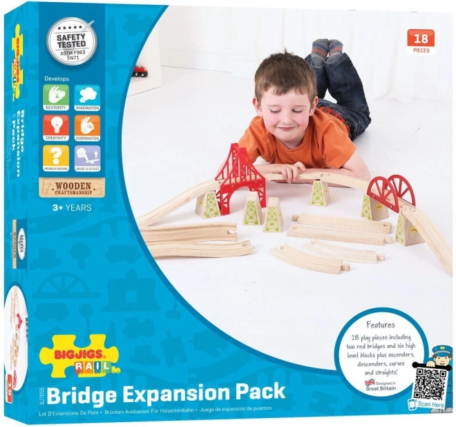 Breid je houten treinbaan uit met een universele brugset met 18 delen, die nieuwe hoogtes en avontuur aan het spel toevoegt. De set bevat stijgende en dalende rails, steunpilaren en bridgelementen om obstakels eenvoudig te overbruggen. Volledig compatibel met de meeste houten treinbanen en gemaakt van kwalitatief hoogwaardig hout. Compatibiliteit, kwalitatieve materialen, veilig spel en stimulatie van verbeelding en fijne motoriek.