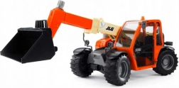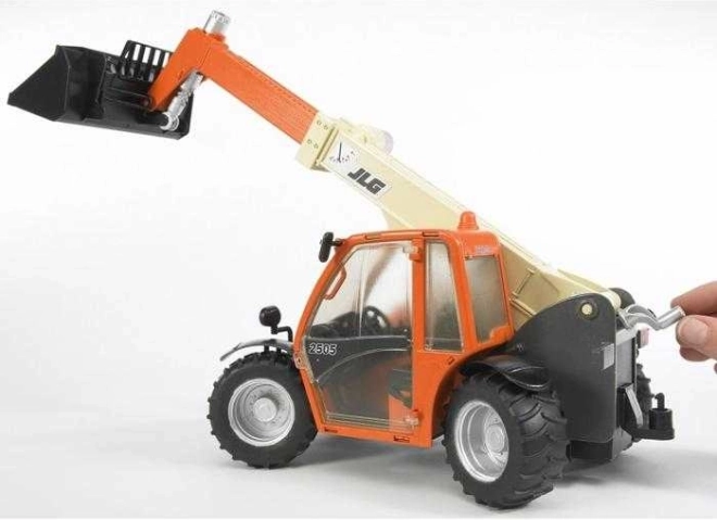 De telescopische giek wordt geheven met een zwengel aan de achterkant en kan worden uitgeschoven tot een lengte van 40 cm. De voorlaadschop is kantelbaar en eenvoudig te vervangen door BRUDER-accessoires (pallet, lier, vorken – BR2318). De cabine van onbreekbaar polycarbonaat met openende deuren en een trekhaak maken de authentieke bediening van de machine compleet.