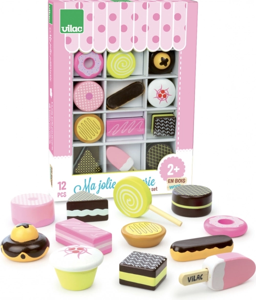Geef kleine banketbakkers en koks plezier in het spel met de set houten zoetigheden van VILAC. De kleurrijke gebakjes en lekkernijen zien eruit als echt, passen perfect in de kinderkeuken en bij het winkeltje spelen, en stimuleren op een prettige manier zowel de verbeelding als de fijne motoriek.