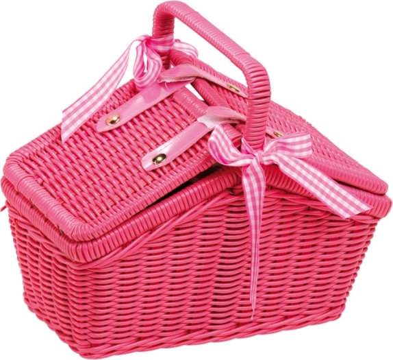 Deze roze picknickmand is de ideale metgezel voor uitstapjes met poppen en voor kindertheepartijtjes. Modern ontwerp in jaren-70-stijl in combinatie met metalen servies met bloemenpatroon zal kleine gastvrouwen en gastheren verheugen. De mand van kunstvlechtwerk is ruim genoeg voor de hele servieset en kleine lekkernijen.