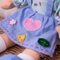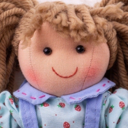 De stoffen pop Grace is gemaakt van zacht textielmateriaal, wat zorgt voor veiligheid en comfort tijdens het spelen.