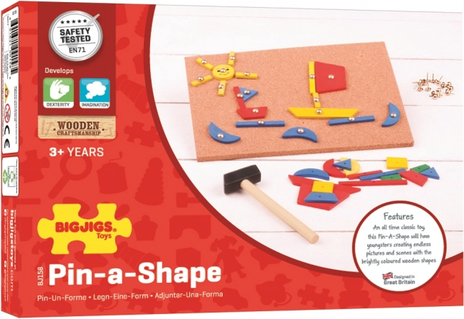 Dit kleurrijke prikbord is ideaal voor kleine bouwers. Kinderen kunnen de gekleurde houten vormen combineren volgens de meegeleverde voorbeelden of hun eigen fantasie en ze vastzetten met glanzende punaises. Er is ook een stevig hamertje en een kurkbord inbegrepen, zodat je direct na het uitpakken kunt spelen.