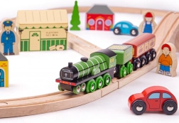 De Flying Scotsman behoort tot de bekendste treinen van zijn tijd en met deze houten treinbaan kunnen kinderen zijn beroemde reizen opnieuw beleven. De set bevat een prachtig uitgewerkte trein die je meeneemt op een nostalgische rit vol viaducten en natuurschoon. Er zijn ook retrostations, huizen en auto’s langs het spoor inbegrepen.