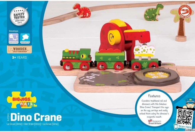 Verbind de wereld van spoorwegen en de prehistorie met de houten dinosauruskraan van Bigjigs Rail. De bewegende nek met magnetische “bek” laadt moeiteloos dinosaurus-eieren op het wagentje; het spel stimuleert de fijne motoriek en de verbeelding. De accessoires zijn compatibel met de meeste houten treinbanen en zijn gemaakt van kwalitatieve, veilige materialen.